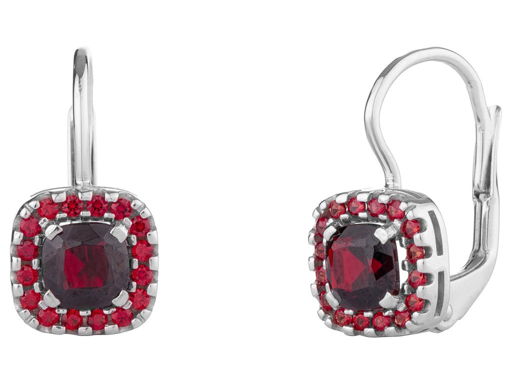Silver earrings with czech garnet, rhodium plated - square