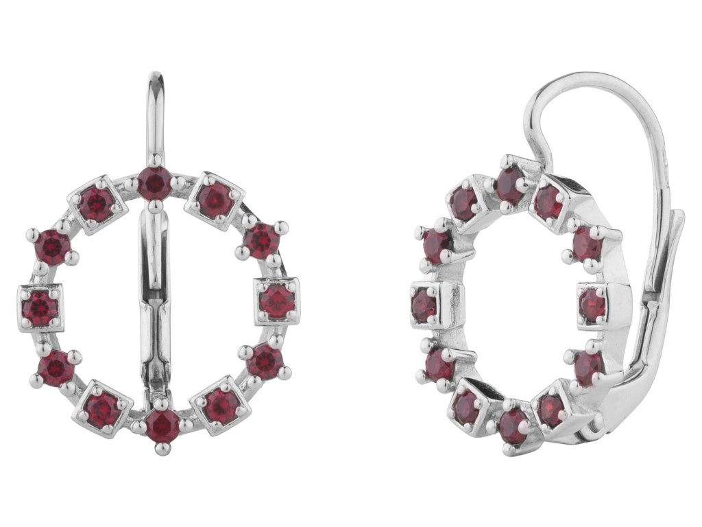 Tyto elegantní náušnice jsou vyrobeny ze stříbra (Ag 925/1000) a zušlechtěny rhodiováním. Jsou zdobeny českým granátem. Náušnice mají motiv kruh o velikosti 14x14 mm.