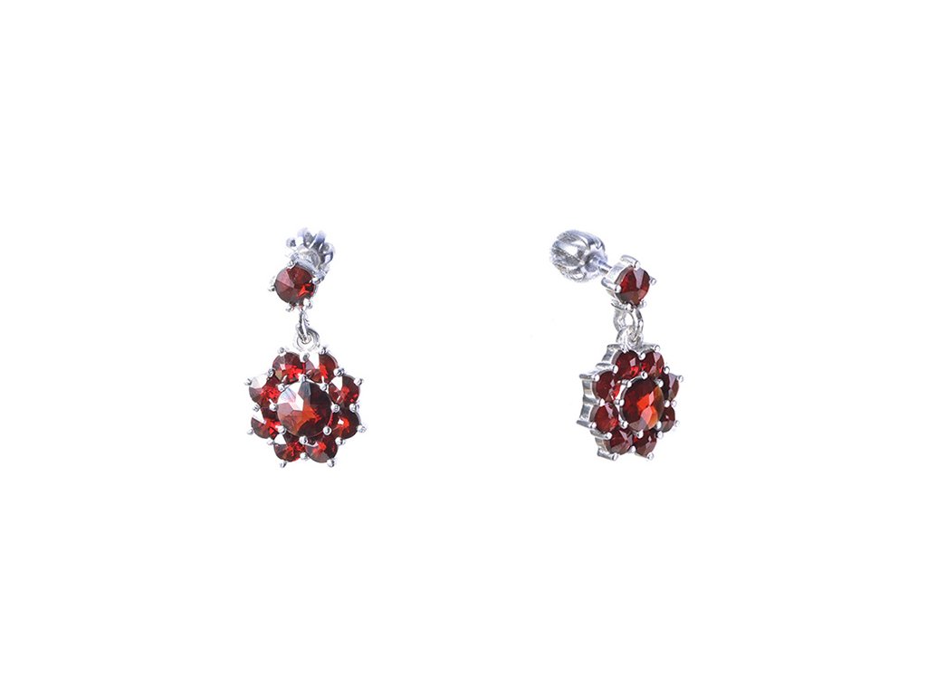Stříbrné náušnice s českým granátem, rhodiované - květina