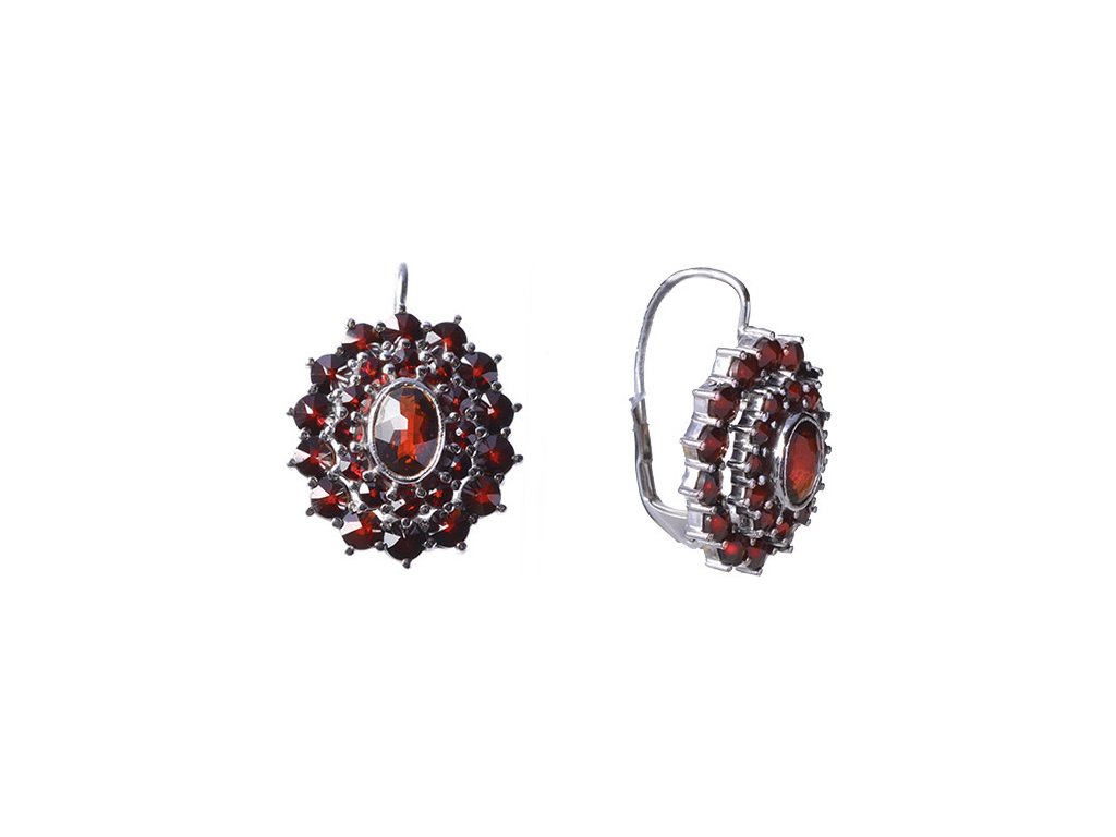 Tyto stylové náušnice jsou vyrobeny ze stříbra (Ag 925/1000) a zušlechtěny rhodiováním. Jsou zdobeny českým granátem a almandinem. Šperku dominuje středový almandin. Náušnice mají tvar ovál o velikosti 18x15 mm. V nabídce jsou i varianty s jiným zapínáním.