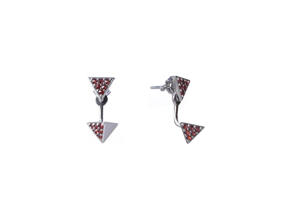 Tyto stylové náušnice jsou vyrobeny ze stříbra (Ag 925/1000) a zušlechtěny rhodiováním. Jsou zdobeny českým granátem. Náušnice mají motiv trojúhelník o velikosti 19x8 mm. V nabídce jsou i varianty s jiným zapínáním.