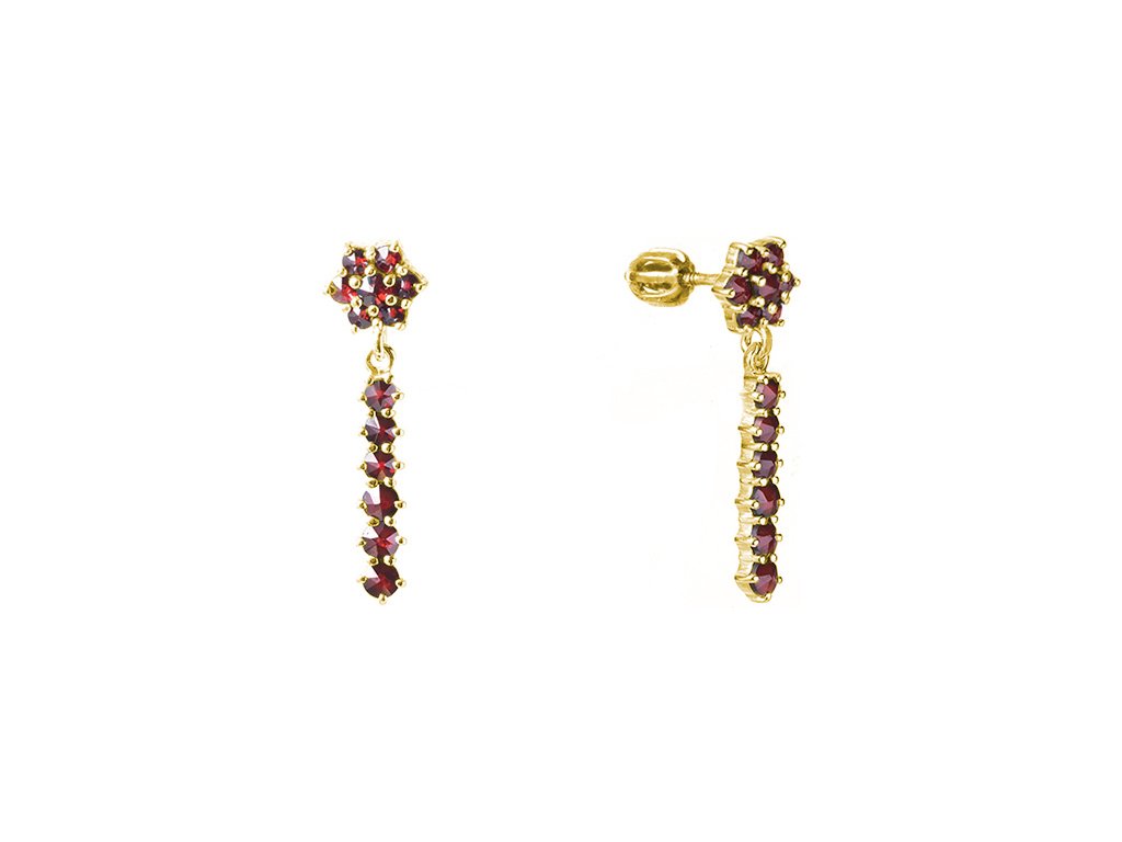 Tyto stylové náušnice jsou vyrobeny ze stříbra (Ag 925/1000) a zušlechtěny zlacením. Jsou zdobeny českým granátem a almandinem. Náušnice mají motiv linka o velikosti 28x6 mm. V nabídce jsou i varianty s jiným zapínáním.