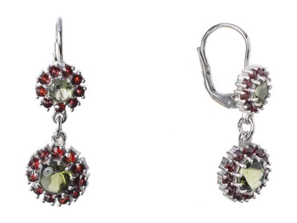 Stříbrné náušnice s českým granátem a vltavínem, rhodiované - květina