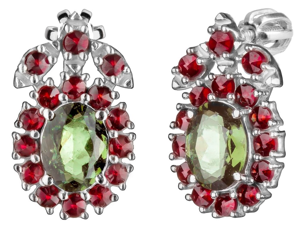 Silver earrings with czech garnet and moldavite, rhodium plated - oval