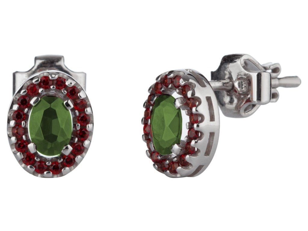 Stříbrné náušnice s českým granátem a vltavínem, rhodiované - ovál