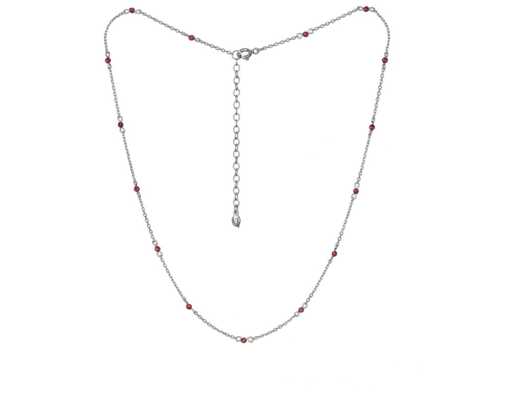 Tento elegantní náhrdelník je vyroben ze stříbra (Ag 925/1000) a zušlechtěn rhodiováním. Je zdoben českým granátem o velikosti 2,4 mm.