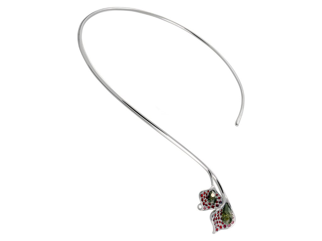 Tento stylový náhrdelník je vyroben ze stříbra (Ag 925/1000) a zušlechtěn rhodiováním. Je zdoben českým granátem a vltavínem. Šperku dominuje středový vltavín. Náhrdelník má motiv kala o velikosti 17x34 mm.