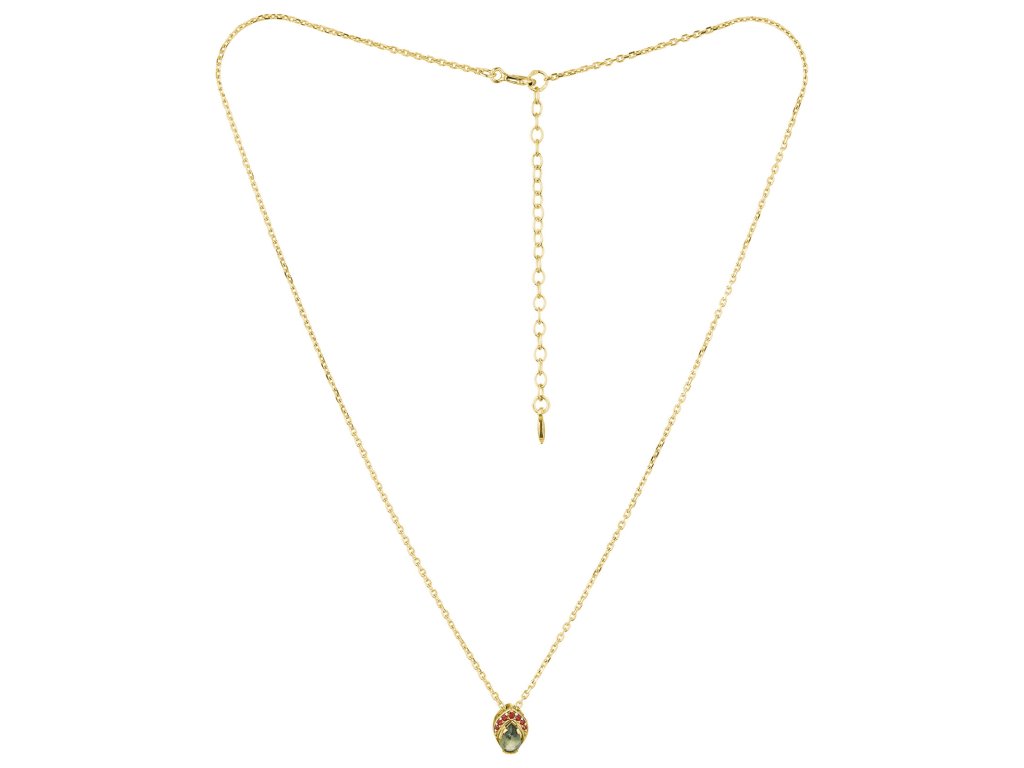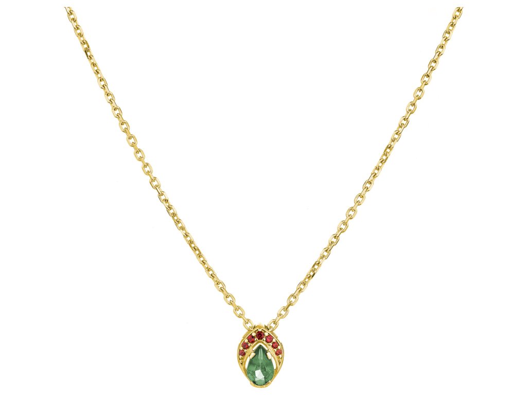 Tento stylový náhrdelník je vyroben ze stříbra (Ag 925/1000) a zušlechtěn zlacením. Je zdoben českým granátem a vltavínem. Šperku dominuje středový vltavín. Náhrdelník má motiv kapka o velikosti 10x7 mm.