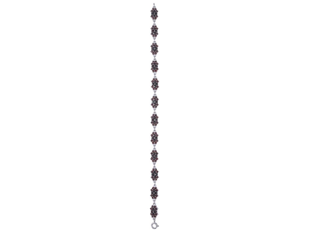 Tento elegantní náramek je vyroben ze stříbra (Ag 925/1000) a zušlechtěn rhodiováním. Je zdoben českým granátem a almandinem. Náramek má motiv květina o velikosti 11x6 mm.