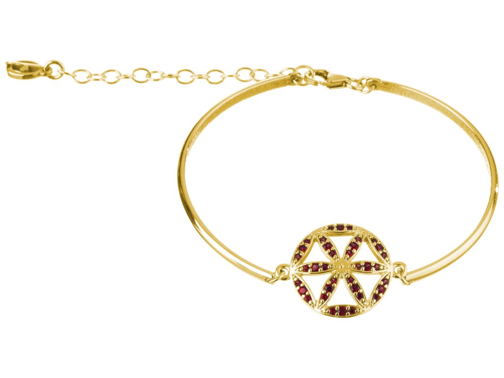 Tento stylový náramek je vyroben ze stříbra (Ag 925/1000) a zušlechtěn zlacením. Je zdoben českým granátem. Náramek má motiv květ života o velikosti 15x15 mm.