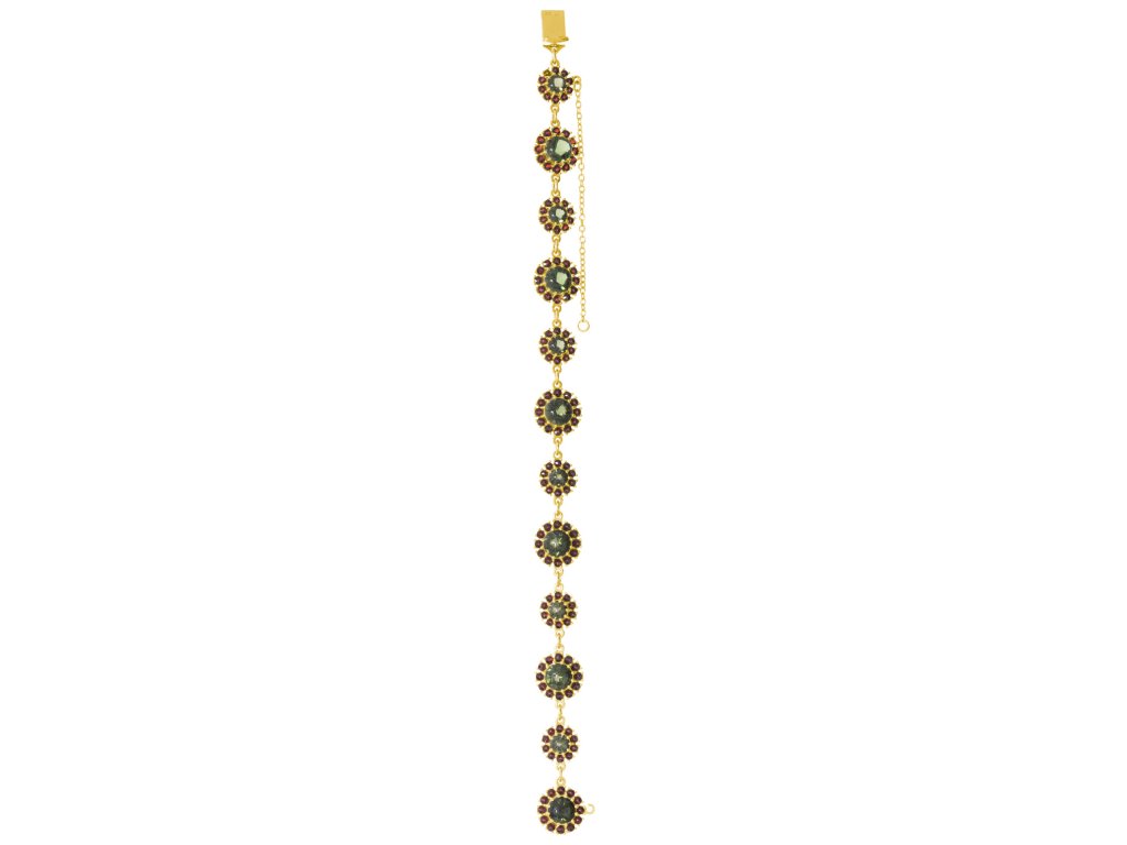 Stříbrný náramek s českým granátem a vltavínem, zlacený - květina