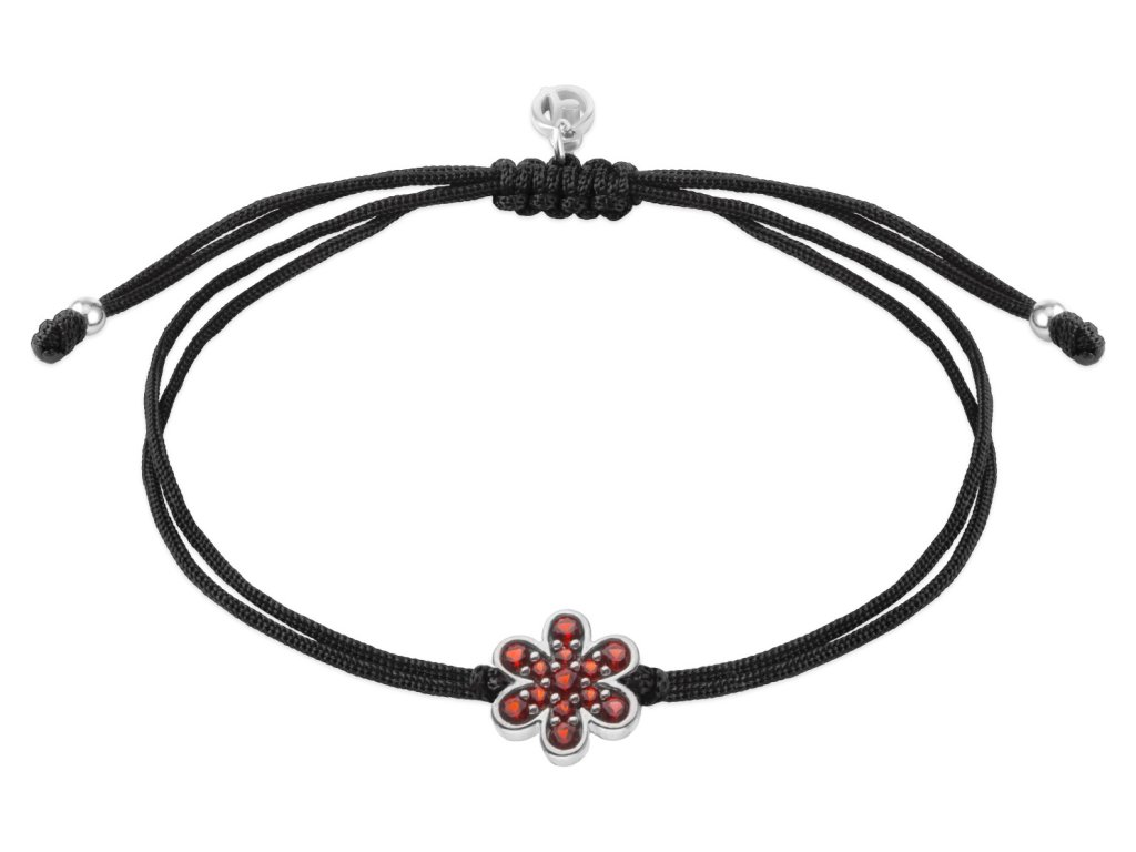 Stříbrný náramek Shamballa s českým granátem, rhodiovaný - květina