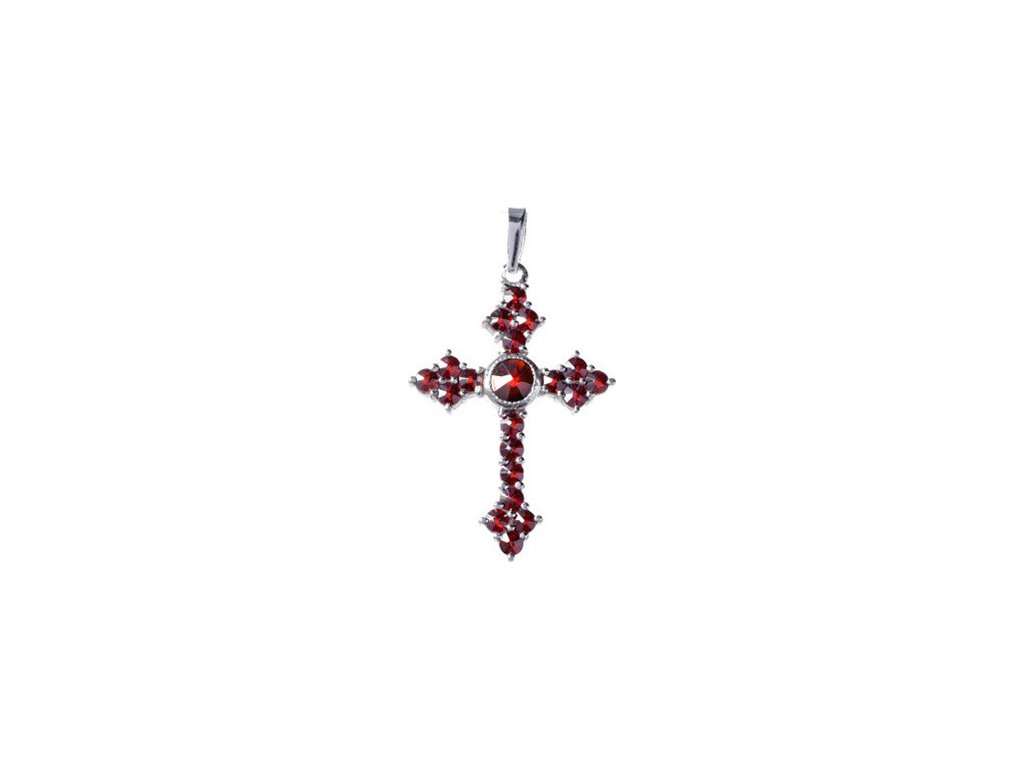 Tento stylový přívěsek je vyroben ze stříbra (Ag 925/1000) a zušlechtěn rhodiováním. Je zdoben českým granátem a almandinem. Šperku dominuje středový almandin. Přívěsek má motiv křížek o velikosti 25x20 mm.