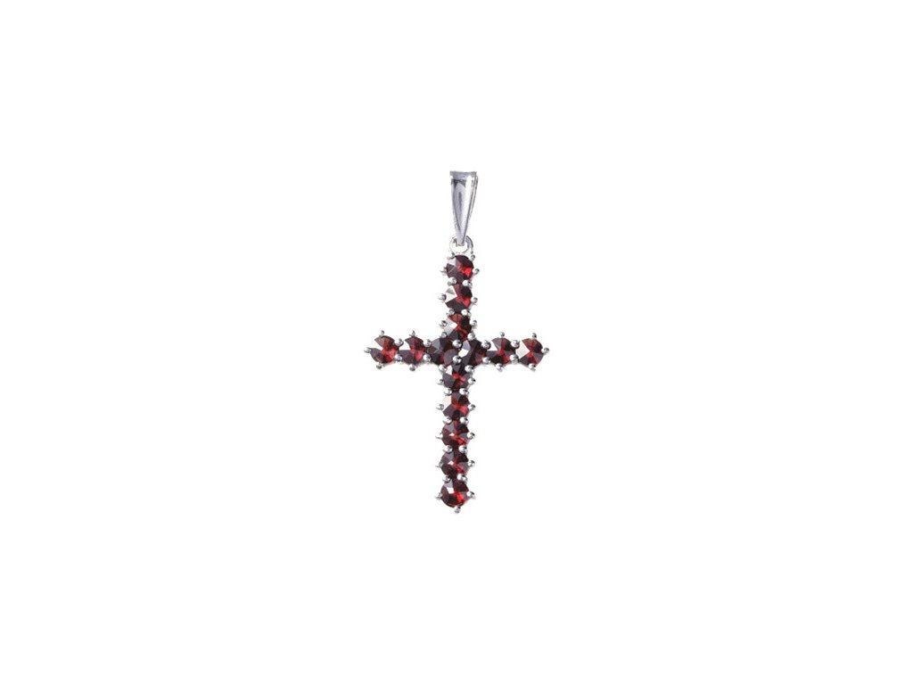 Stříbrný přívěsek s českým granátem, rhodiovaný - křížek