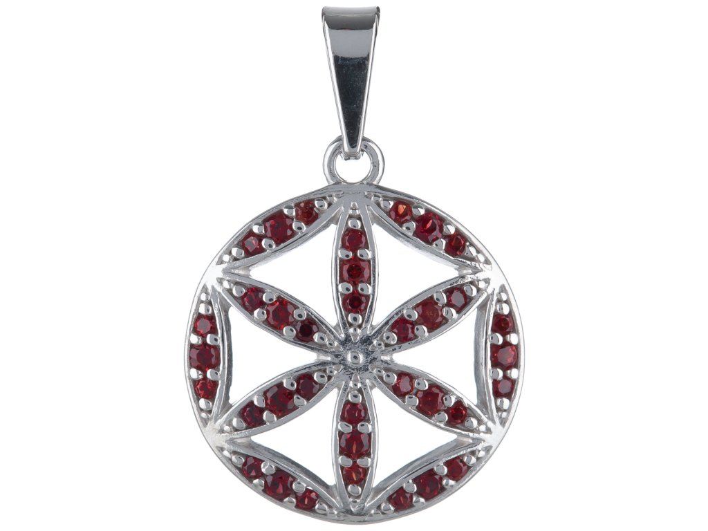 Silver pendant with czech garnet, rhodium plated - flower of life
