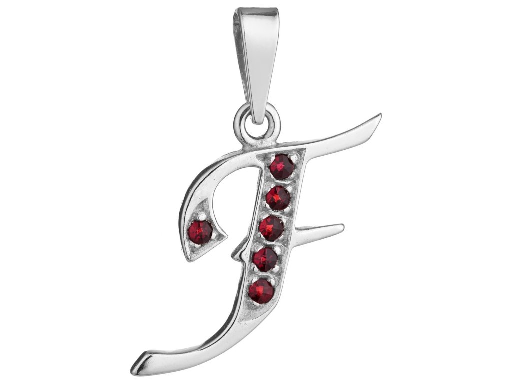 Tento stylový přívěsek je vyroben ze stříbra (Ag 925/1000) a zušlechtěn rhodiováním. Je zdoben českým granátem. Přívěsek má motiv písmeno F o velikosti 18x14 mm.