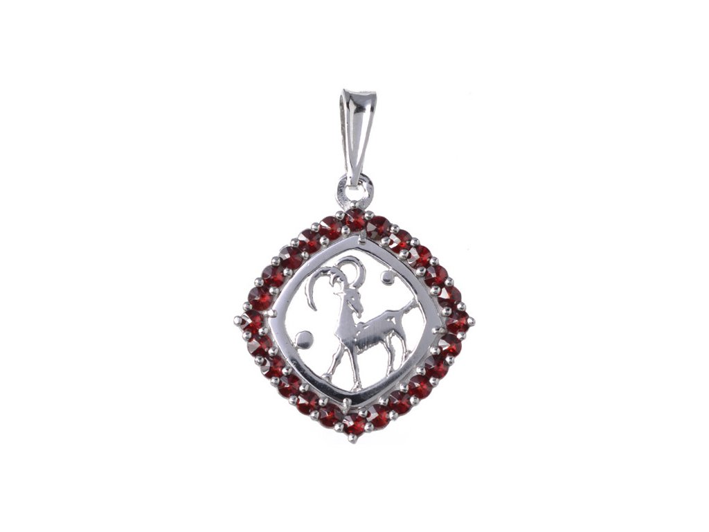 Silver pendant with czech garnet, rhodium plated, zodiac sign - capricorn