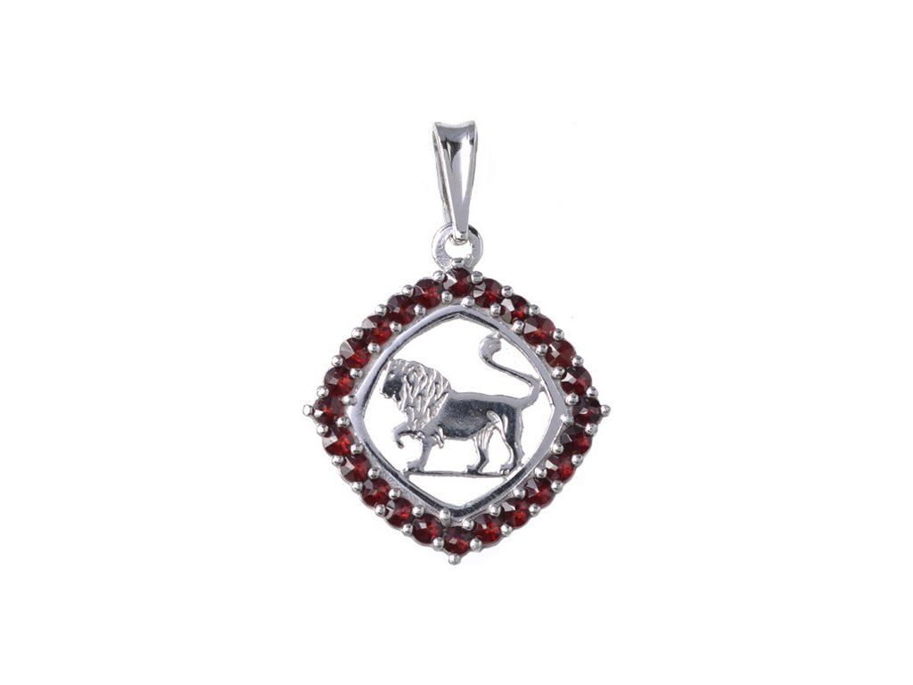 Silver pendant with czech garnet, rhodium plated, zodiac sign - lion