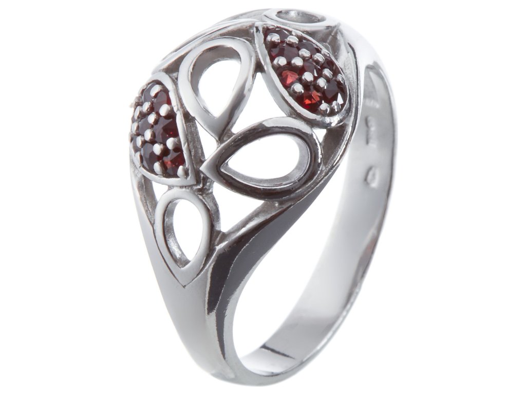 Tento stylový prsten je vyroben ze stříbra (Ag 925/1000) a zušlechtěn rhodiováním. Je zdoben českým granátem. Prsten má motiv o velikosti 17x12 mm.