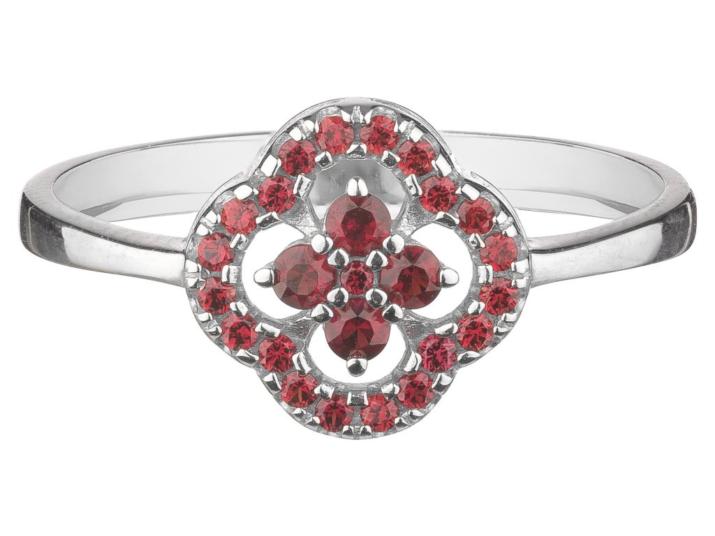 Tento stylový prsten je vyroben ze stříbra (Ag 925/1000) a zušlechtěn rhodiováním. Je zdoben českým granátem. Rozměr motivu je 11x11 mm.