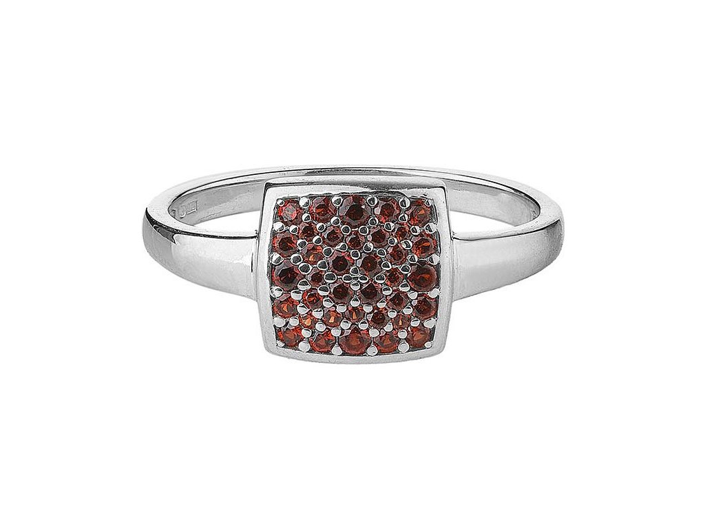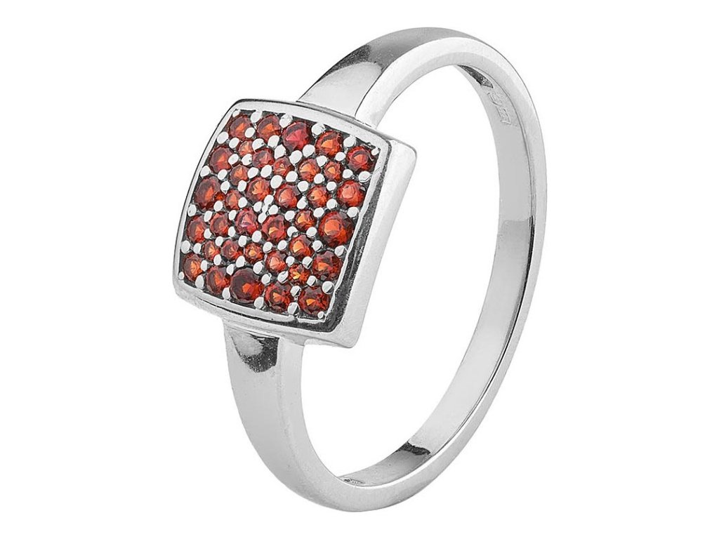 Tento stylový prsten je vyroben ze stříbra (Ag 925/1000) a zušlechtěn rhodiováním. Je zdoben českým granátem. Prsten má motiv obdélník o velikosti 10x10 mm.