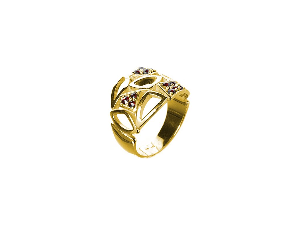 Tento elegantní prsten je vyroben ze stříbra (Ag 925/1000) a zušlechtěn zlacením. Je zdoben českým granátem. Prsten má motiv o velikosti 21x16 mm.
