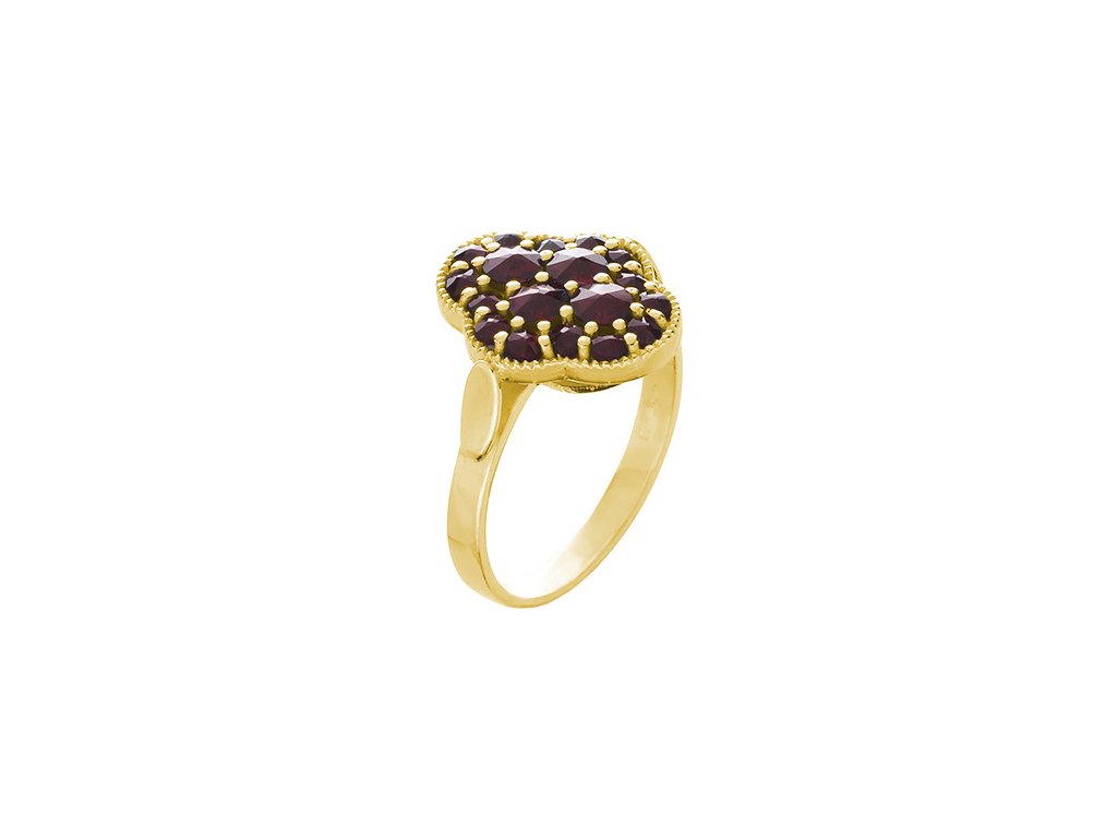 Tento stylový prsten je vyroben ze stříbra (Ag 925/1000) a zušlechtěn zlacením. Je zdoben českým granátem a almandinem. Prsten má motiv o velikosti 14x12 mm.