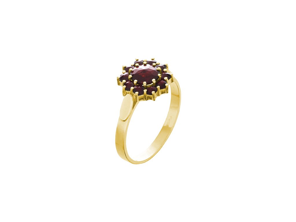 Tento stylový prsten je vyroben ze stříbra (Ag 925/1000) a zušlechtěn zlacením. Je zdoben českým granátem a almandinem. Šperku dominuje středový almandin. Prsten má motiv květina o velikosti 10x10 mm.