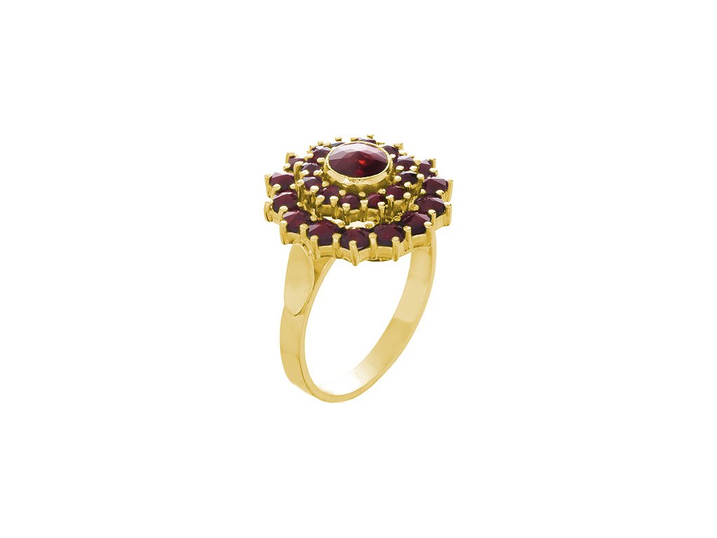 Tento stylový prsten je vyroben ze stříbra (Ag 925/1000) a zušlechtěn zlacením. Je zdoben českým granátem a almandinem. Šperku dominuje středový almandin. Prsten má motiv květina o velikosti 15x15 mm.