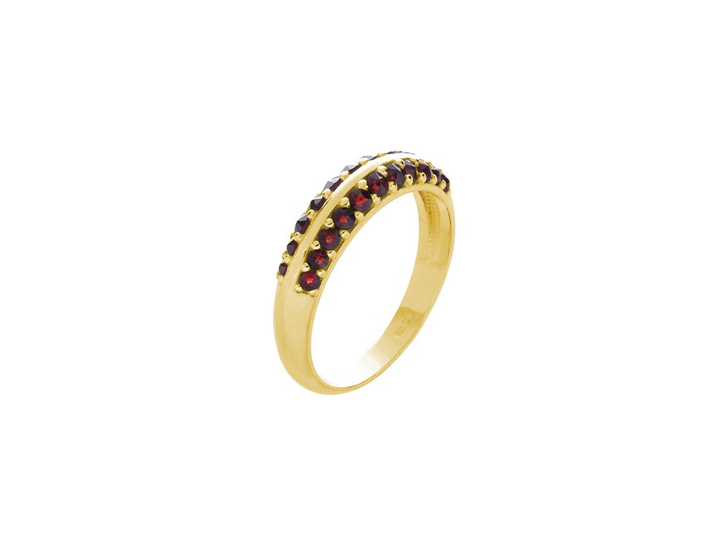 Tento elegantní prsten je vyroben ze stříbra (Ag 925/1000) a zušlechtěn zlacením. Je zdoben českým granátem. Prsten má motiv linka o velikosti 20x5 mm.