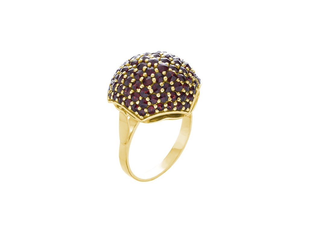 Tento stylový prsten je vyroben ze stříbra (Ag 925/1000) a zušlechtěn zlacením. Je zdoben českým granátem. Prsten má motiv malina o velikosti 19x17 mm.