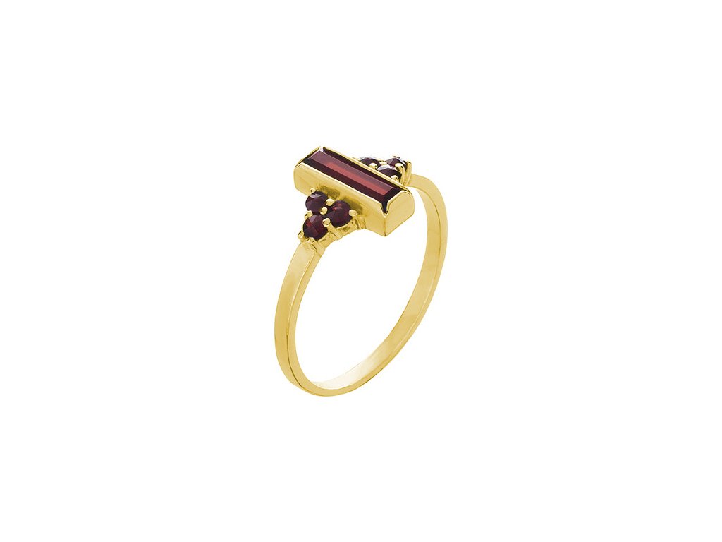 Tento stylový prsten je vyroben ze stříbra (Ag 925/1000) a zušlechtěn zlacením. Je zdoben českým granátem a almandinem. Šperku dominuje středový almandin. Prsten má motiv obdélník o velikosti 12x10 mm.