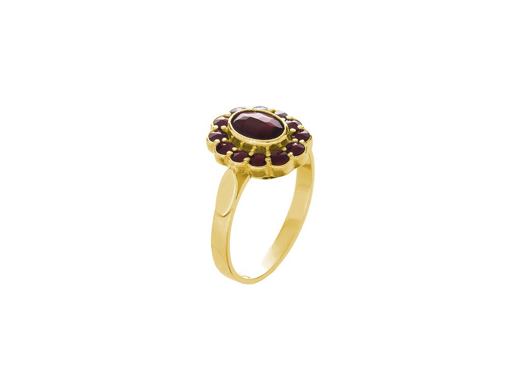 Tento stylový prsten je vyroben ze stříbra (Ag 925/1000) a zušlechtěn zlacením. Je zdoben českým granátem a almandinem. Šperku dominuje středový almandin. Prsten má tvar ovál o velikosti 13x10 mm.