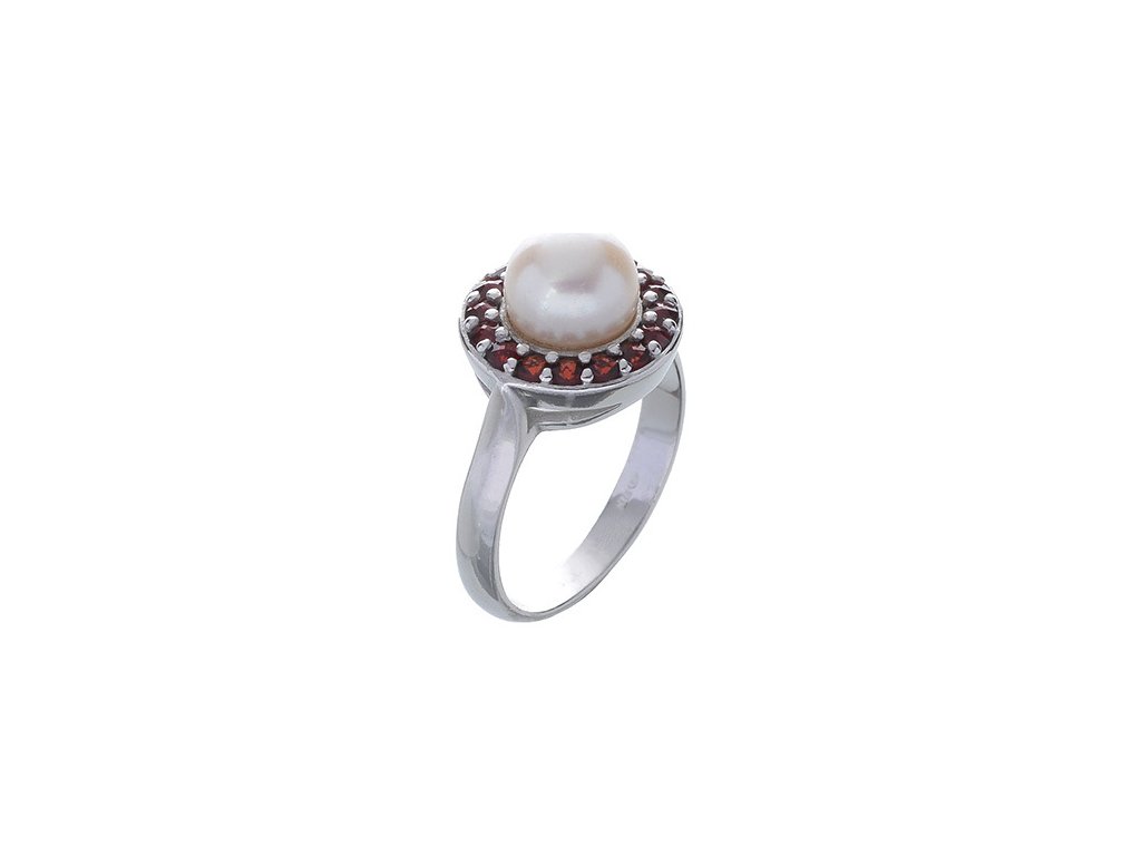 Silver ring with czech garnet and pearl, rhodium plated - circle
