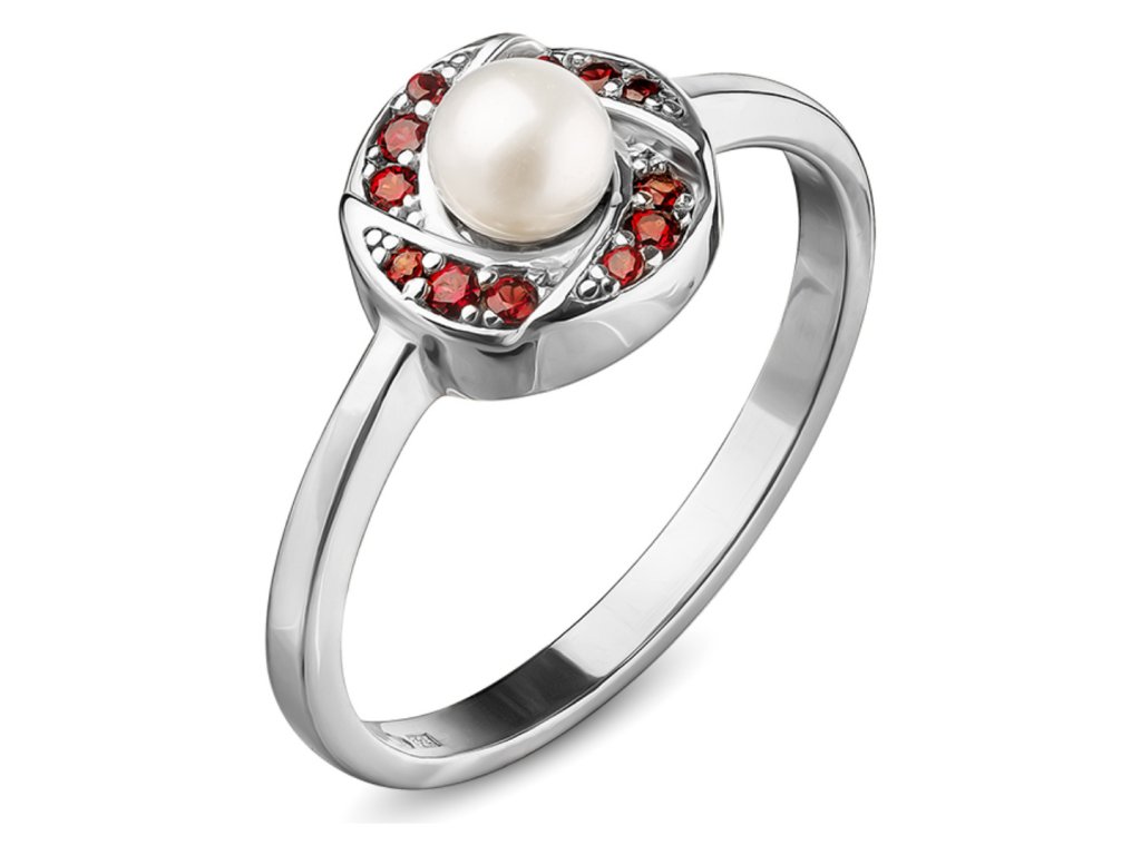 Silver ring with czech garnet and pearl, rhodium plated - circle