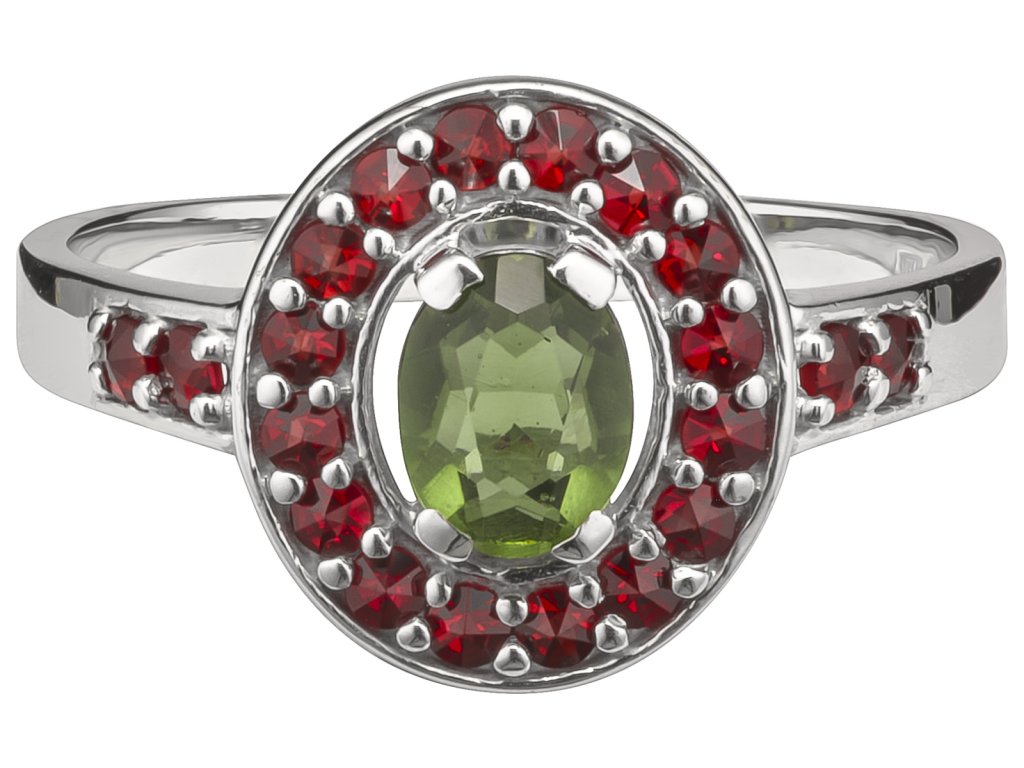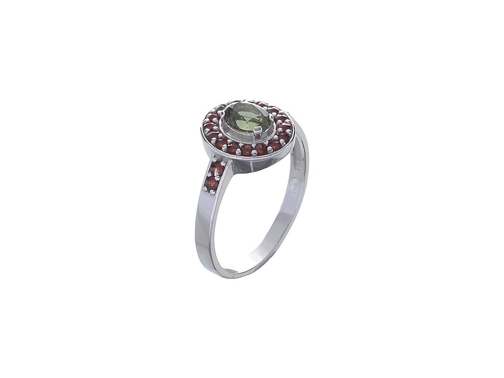 Stříbrný prsten s českým granátem a vltavínem, rhodiovaný - ovál
