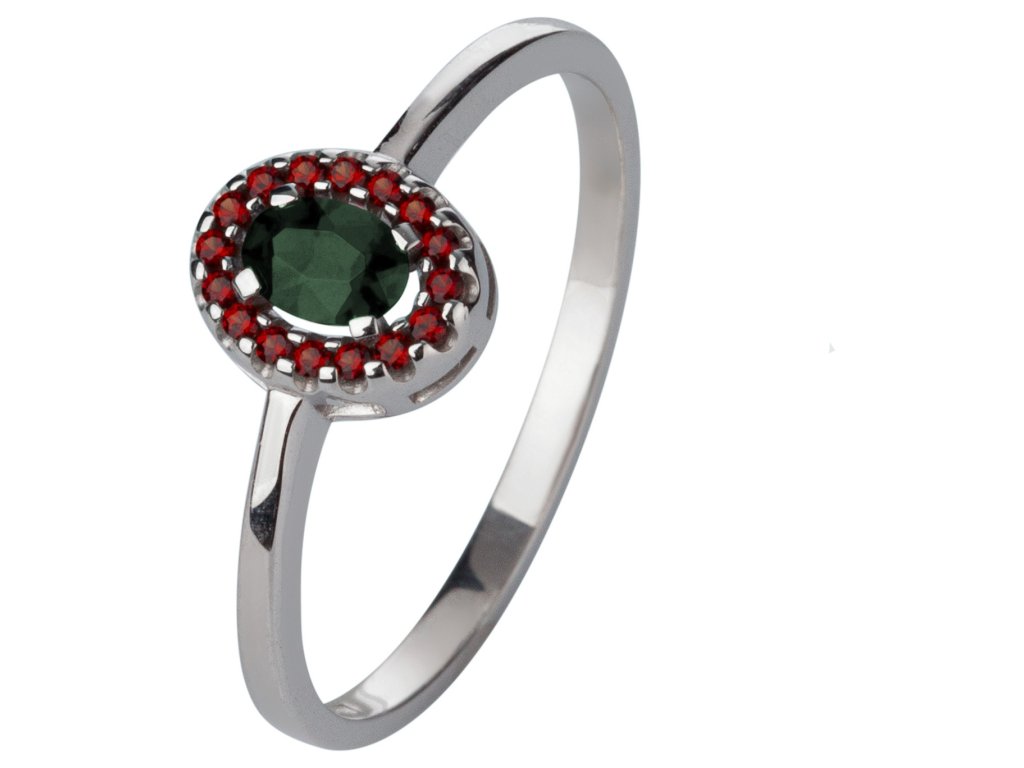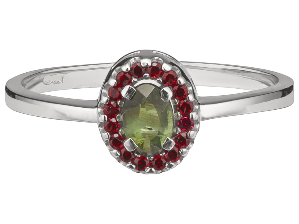 Stříbrný prsten s českým granátem a vltavínem, rhodiovaný - ovál