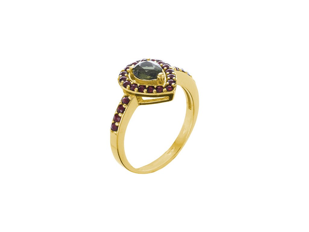 Silver ring with czech garnet and moldavite, gold plated - drop