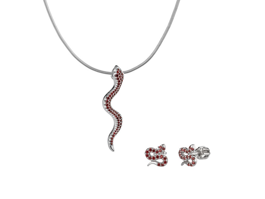 | Tato souprava je vyrobena ze stříbra Ag 925/1000 a zušlechtěna rhodiováním. Je zdobena českým granátem s motivem had . Soupravu tvoří náušnice, přívěsek a řetízek. |
