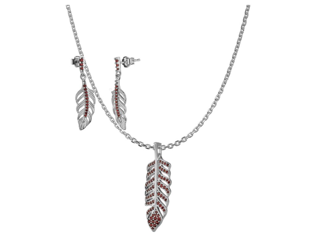 Stříbrný set šperků 1459 s českým granátem, rhodiovaný - pírko