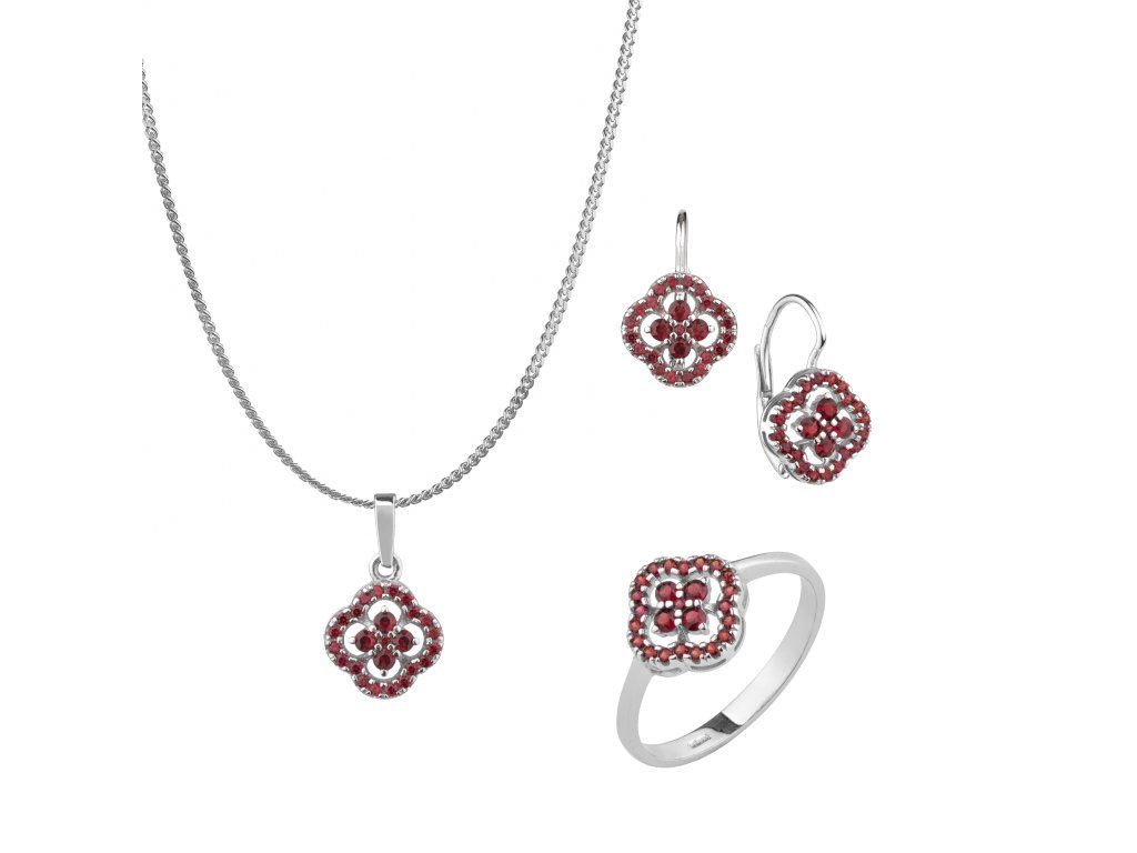 | Tato souprava je vyrobena ze stříbra Ag 925/1000 a zušlechtěna rhodiováním. Je zdobena českým granátem. Soupravu tvoří prsten, náušnice, přívěsek a řetízek. |