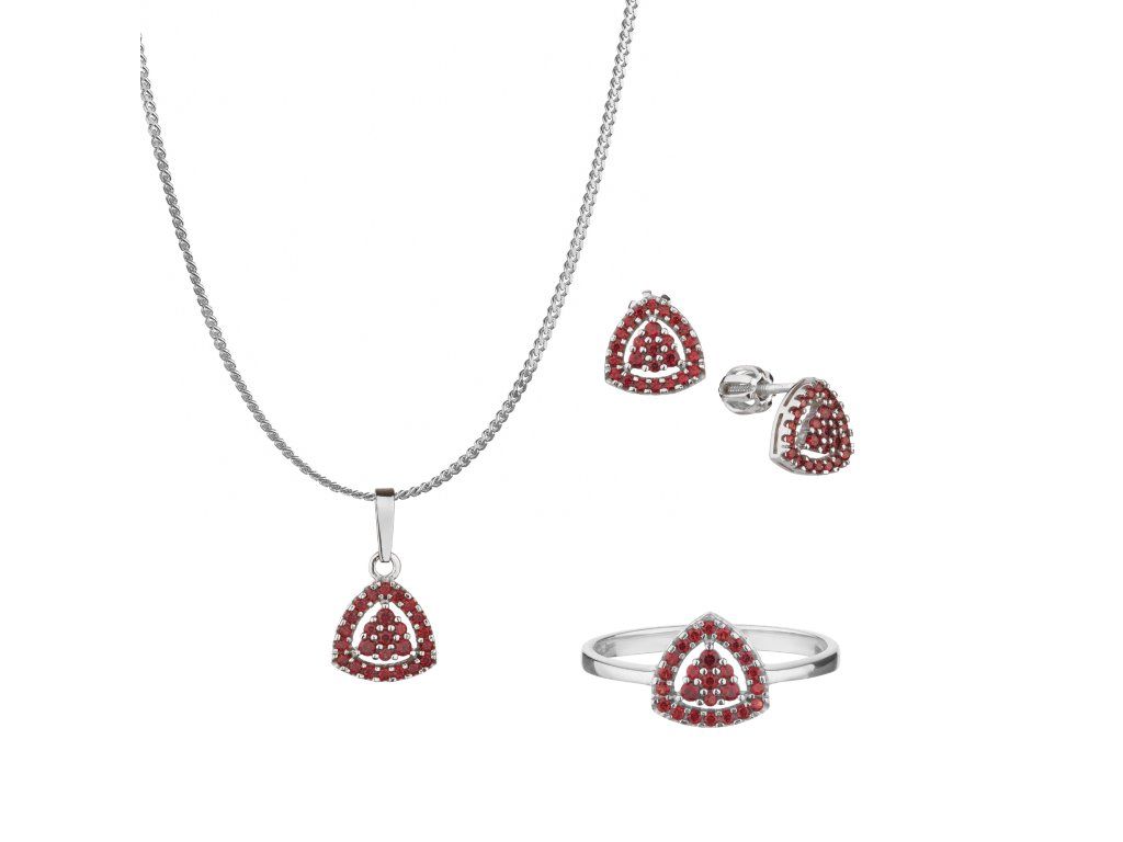 | Tato souprava je vyrobena ze stříbra Ag 925/1000 a zušlechtěna rhodiováním. Je zdobena českým granátem s motivem trojúhelník. Soupravu tvoří prsten, náušnice, přívěsek a řetízek. |