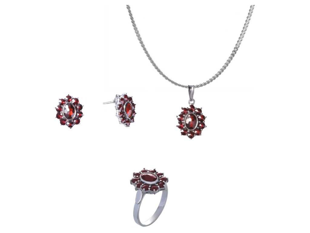 | Tato souprava je vyrobena ze stříbra Ag 925/1000 a zušlechtěna rhodiováním. Je zdobena českým granátem a almandinem s motivem ovál. Soupravu tvoří prsten, náušnice, přívěsek a řetízek. |