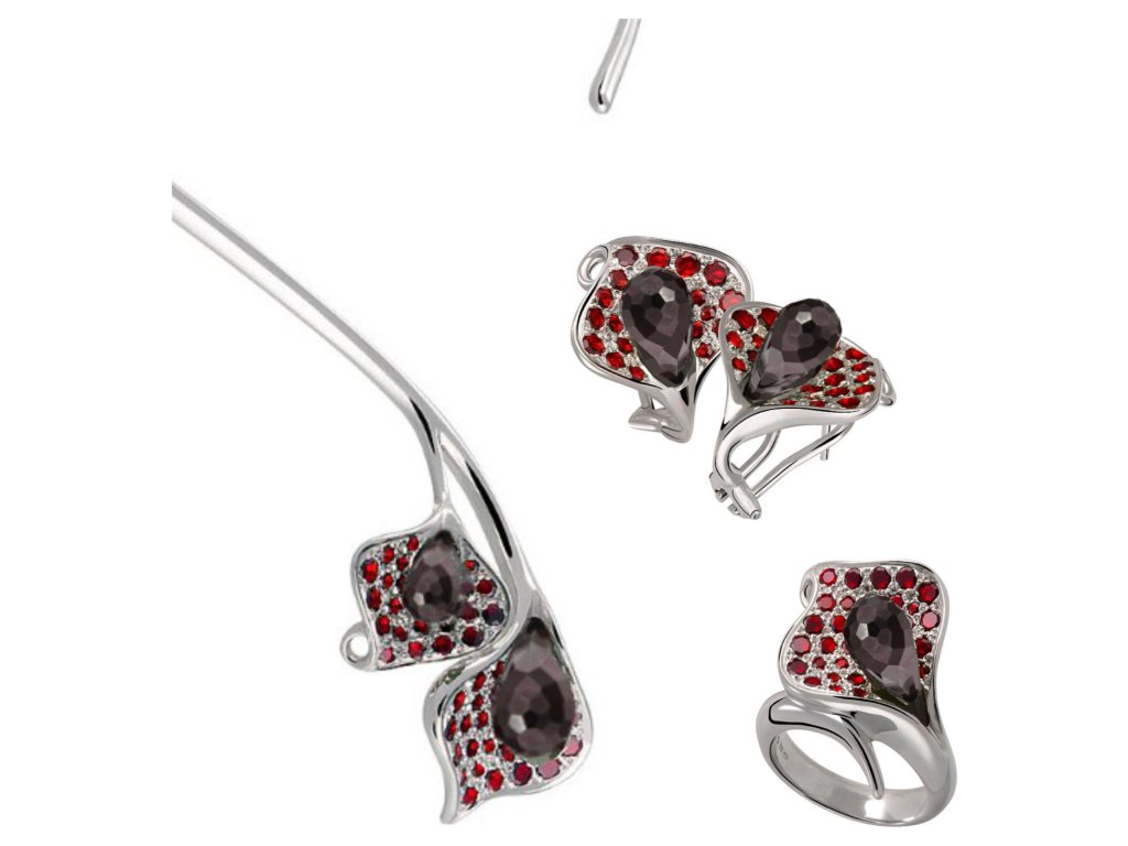 | Tato souprava je vyrobena ze stříbra Ag 925/1000 a zušlechtěna rhodiováním. Je zdobena českým granátem a almandinem s motivem kala. Soupravu tvoří prsten, náušnice a náhrdelník. |