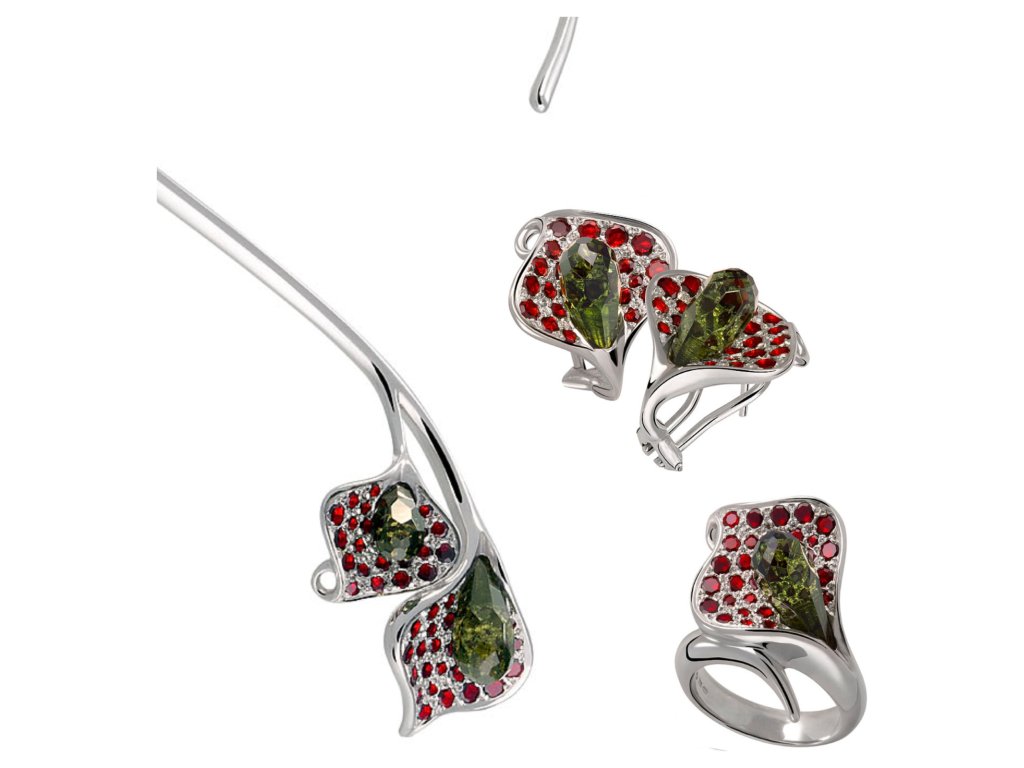 | Tato souprava je vyrobena ze stříbra Ag 925/1000 a zušlechtěna rhodiováním. Je zdobena českým granátem a vltavínem s motivem kala. Soupravu tvoří prsten, náušnice a náhrdelník. |